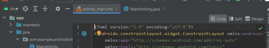 Przechodzimy do edycji pliku activity_main.xml w widoku Code: